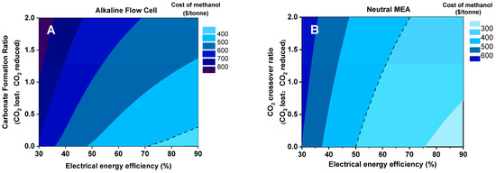 (A) The impact of carbonate formation rate and electrical energy efficiency on the cost of methanol production in an alkaline flow cell. (B) The effect of crossover and energy efficiency on neutral MEA electrolytic cells.