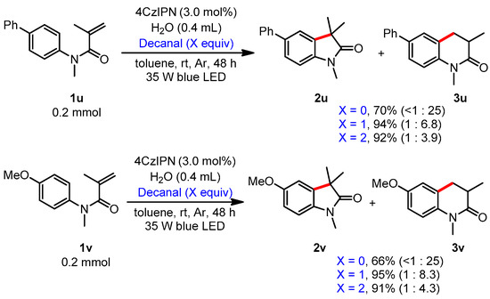 Because of the superior electrocyclization reactivity, the π-extension substrates such as biphenyl acrylamide (1u) and N-(4-methoxyphenyl)-N-methylmethacrylamide (1v) led to the formation of 3,4-dihydroquinolinones as the major products in the current systems (3u and 3v). Besides, we changed the equivalent amounts of the decanal to explore the site-selectivity control for 6-endo-trig vs. 5-exo-trig cyclization of N-([1,1′-biphenyl]-4-yl)-N-methylmethacrylamide. While exclusive 6-endo-trig selectivity was observed in the absence of aldehyde additives, the 5-exo-trig cyclization process was enhanced when increasing the amount of decanal (Figure 4). The results indicate that the addition of aldehyde additives in the systems could alter the reaction pathways over 5-exo-trig cyclization.