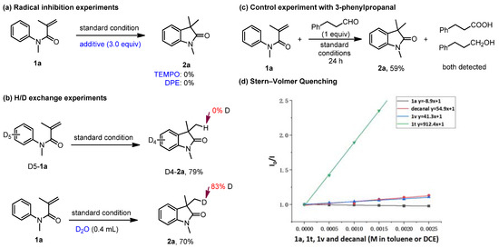 Next, control experiments were conducted to gain mechanistic insights into the present aldehyde-promoted hydroarylation reaction (Scheme 1). The addition of the radical scavenger 2,2,6,6- tetramethylpiperidin-1-oxyl (TEMPO) or 1,1-diphenylethylene (DPE) to the standard conditions caused complete quenching in the yield of 2a (Scheme 1a). The H/D exchange experiments show that when D5-labeled N-acylaniline (D5-1a) was used, no D incorporation of cyclized products was observed. Comparably, the addition of D2O led to 83% incorporation of D into newly formed methyl groups (Scheme 1b), indicating the hydrogen in the reaction being derived from water. The control experiment with 3-phenylpropanal under the standard conditions within 24 h furnished the oxindole product 2a in 59% yield, along with the detection of both 3-phenylpropanoic acid and 3-phenylpropan-1-ol. This result suggests the by-product formation from aliphatic aldehyde. The Stern−Volmer quenching experiments indicate that while the acrylamide 1a had not fluorescence quenching effect, the decanal additive quenched slightly the fluorescence emission of excited 4CzIPN (KSV = 54.9, Scheme 1d). Our previous work had also demonstrated that the substrate 1v (KSV = 41.3) and 1t (KSV = 912.4) show also quenching effect, which could be attributed to energy transfer [36]. Finally, the results of the light on/off experiment showed that the present reaction was a continuous illumination reaction (See Supplementary Materials for details).