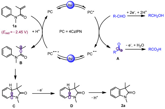 On the basis of above results of mechanistic studies and previous reports, a possible reaction mechanism involving basically consecutive photoinduced electron transfer (ConPET) [40,42] was proposed (Scheme 2). The 4CzIPN photocatalyst absorbs photon to generate its excited state PC*, which oxidize the aldehydes to give PC anion radical and acyl radical A. The second irradiation of it occurs to afford the excited state of PC anion radical. This highly reductive species (Ered < −2.9 V vs. SCE) [43] undergoes single electron transfer with acrylamide 1a (Ered = −2.45 V vs. SCE) with the assistance of proton to produce the radical species B. The subsequent intramolecular radical cyclization, single electron transfer, and deprotonation sequentially proceed to afford the final product 2a. The formation of 3-phenylpropanoic acid and 3-phenylpropan-1-ol can be attributed to the further oxidization of acyl radical and two electron reduction of aldehyde, respectively. We suspect that aliphatic aldehydes have higher reductive potential so that they are easier to be oxidized by the excited photocatalyst.