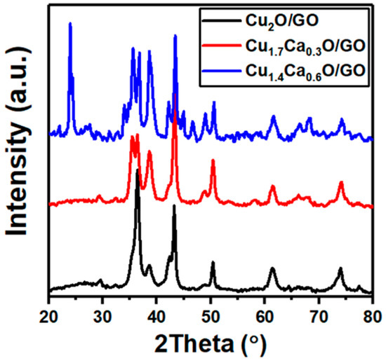 XRD pattern of Cu2O/GO and a different concentration of Cu2CaO/GO.