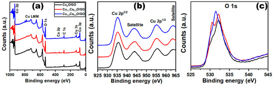 Plots of (a) XPS survey spectra, (b) Cu 2p, and (c) O 1s for the Cu2−xCaxO/GO nanostructures.