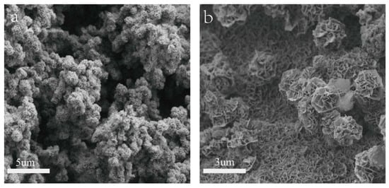 Shown in Figure 1 are the SEM images of NiMn-LDHs/NF and NiMn-LDHs/rGO/NF synthesized by hydrothermal method. It can be seen from Figure 1a that the synthesized NiMn-LDHs agglomerate on the surface of NF to form particles as large as 1 μm. In contrast, as displayed in Figure 1b, the ultrathin sheets of NiMn-LDHs are cross-linked and assembled vertically and uniformly on the surface of rGO to form nano-walled networks, which are certainly beneficial for the enlargement of the specific area of the synthesized composite electrode. Therefore, rGO undoubtedly plays a role to prevent NiMn-LDH nanosheets from aggregating together into large particles.