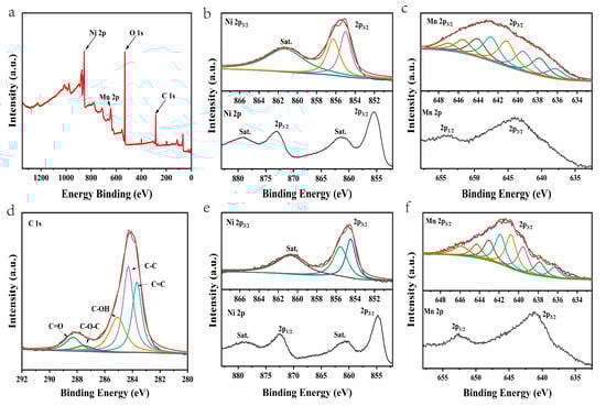 (a) The survey and (b–d) deconvoluted Ni 2p, Mn 2p and C 1s XPS spectra of the NiMn-LDHs/rGO composite along with (e,f) the deconvoluted Ni 2p and Mn 2p spectra of the NiMn-LDHs.