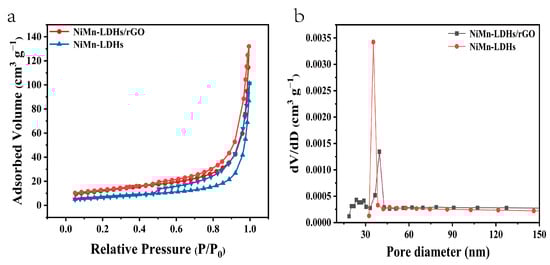 In their N2 adsorption–desorption isotherms shown in Figure 5a, both NiMn-LDH and NiMn-LDH/rGO exhibit typical IV isotherms with a type H3 hysteresis loop, indicating that mesopores are randomly distributed and interconnected. Moreover, the calculated specific surface area of NiMn-LDH/rGO (43.18 m2 g−1) is much larger than that of NiMn-LDH (24.00 m2 g−1). Barrett–Joyner–Halenda (BJH) analyses shown in Figure 5b reveal the mesoporous structures of NiMn-LDH/rGO and NiMn-LDH, whose pore sizes are mainly distributed around 35.28 and 39.74 nm, with total pore volumes of 0.0034 and 0.0013 cm3 g−1, respectively. In comparison with that of NiMn-LDH, the average pore size of NiMn-LDH/rGO is decreased to some extent, which might be a result of the interactions between NiMn-LDH and rGO sheets.