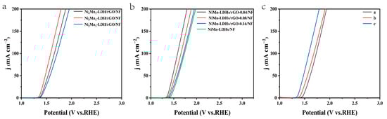 All of the electrochemical tests were conducted on an SP-300 electrochemistry workstation (Bio-Logic, Seyssinet-Pariset, France) in a three-electrode system. The reference electrode was an Hg/HgO one, and the counter electrode was a sheet of platinum. The investigated electrodes, including NiMn-LDHs/rGO/NF, NiMn-LDHs/NF, RuO2/NF and NF, were used as working electrodes, respectively. The electrolyte was a solution of 1 mol L−1 KOH, which was bubbled with pure oxygen for 30 min to maintain oxygen saturation. The potentials achieved were converted into reversible hydrogen ones by the following equation: