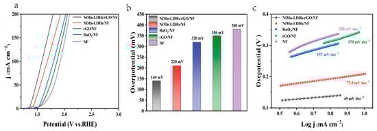 The electrochemical performance of the NiMn-LDHs/rGO/NF composite electrode, along with those of NiMn-LDHs/NF, RuO2/NF and NF for OER, was evaluated in a typical three-electrode system using Hg/HgO and Pt wire as the reference and counter electrodes, respectively, in 1 M aqueous KOH solution. Figure 7a shows the iR-corrected linear sweep voltammetry (LSV) curves at a scan rate of 5 mV s−1 in the potential range of 1.2−3.0 V (vs. RHE). It is notable that the NiMn-LDHs/rGO/NF electrode exhibits the highest polarization current, which is 1.37 V vs. RHE for achieving a current density of 10 mA cm−2. Moreover, it can be seen from Figure 7b that an overpotential as low as 0.14 V is sufficient for the NiMn-LDHs/rGO/NF electrode to operate at 10 mA cm−2 current density, which is lower than that of NiMn-LDHs/NF (0.22 V), RuO2/NF (0.32 V), rGO/NF (0.35 V) or NF (0.38 V) electrode, evidencing the relatively good catalytic efficiency of the NiMn-LDHs/rGO/NF electrode, owing to the synergistic effect induced by the direct and interfacial contact between ultrathin NiMn-LDH nanosheets and partly reduced rGO [24].