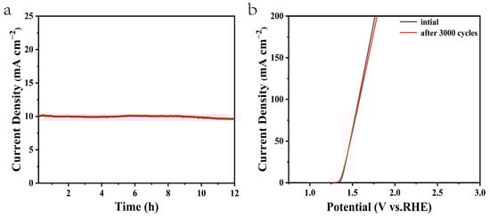 Moreover, the electrochemical stability is another criterion to evaluate the OER catalysts. A chronopotentiometry test under the current density of 10 mA cm−2 was conducted to estimate the stability and durability of the composite electrocatalysts. As shown in Figure 8a, the current density of the NiMn-LDHs/rGO/NF electrode was kept nearly constant for 12 h. From Figure 8b, it can be seen that no obvious change is recorded for the original NiMn-LDHs/rGO/NF electrode and after 3000 CV cycles under the current density of 10 mA cm−2, indicating that the NiMn-LDHs/rGO/NF composite catalyst has excellent stability and durability in alkaline solution. Such improvement may be a result of the high mechanical strength and electrochemical stability of the NiMn-LDHs/rGO/NF electrode.