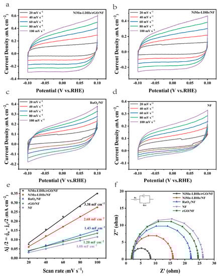 (a–d) CV curves in 1.0 M KOH, (e) linear plot of capacitance vs. scan rate and (f) Nyquist plots for NiMn-LDHs/rGO/NF, NiMn-LDHs/NF, RuO2/NF, rGO/NF and NF.