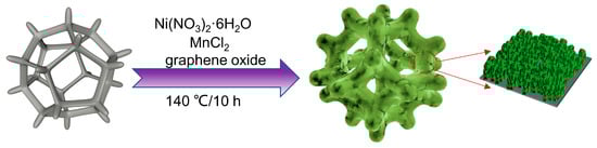 The procedure for the preparation of the self-supporting NiMn-LDHs/rGO/NF composite electrode is depicted in Figure 10. GO was prepared by oxidation of graphite powder using Hummers’ method. A mixture containing 0.12 mmol Ni(NO3)2·6H2O, 0.04 mmol MnCl2 and 0.72 mmol urea was dissolved in 20 mL of deionized water, and then 10 mL of 0.2 mg/mL rGO solution was added. After ultrasonication for 40 min, the solution along with a piece of NF (10 × 10 mm)—which was ultrasonically cleaned in 2 M HCl, acetone, ethanol and deionized water, respectively, and then dried at 333K for 5 h—was poured into a 50 mL Teflon lining autoclave and kept at 140° for 10 h. When the autoclave was cooled naturally to room temperature, the product was collected and washed with a large amount of deionized water to remove the adsorbed substances. The self-supporting NiMn-LDHs/rGO/NF composite electrode was achieved after drying the product in an oven at 60° for 3 h. The self-supporting NiMn-LDHs/NF composite electrode was prepared in the same procedure without the addition of rGO. For comparison, the RuO2/NF electrode was also prepared following the method previously reported [49].