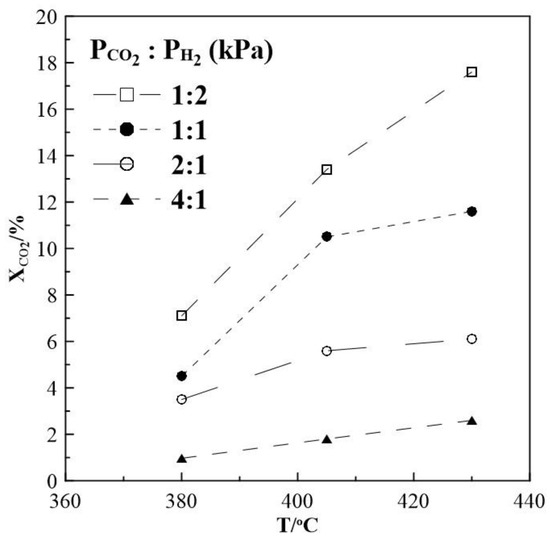 Figure 2 shows the CH4 and CO production rates at steady state as a function of temperature. The rate of the methanation reaction was found to be highest for a gas feed ratio of CO2 to H2 of 1:2. With increasing CO2 partial pressure in the reaction mixture, i.e., a CO2 to H2 ratio of 1:1, 2:1 and 4:1, the observed CH4 formation rate is very low and almost independent of temperature. Figure 2b suggests that the RWGS reaction prevails over the Sabatier reaction. Moreover, as shown in Figure 3, CO appears to be the main product under all feeding CO2 to H2 ratios of this study and its selectivity is higher than 96%, while CH4 selectivity is smaller than 4%. The reaction rate values of the RWGS reaction are more than one order of magnitude higher than those of the methanation one.