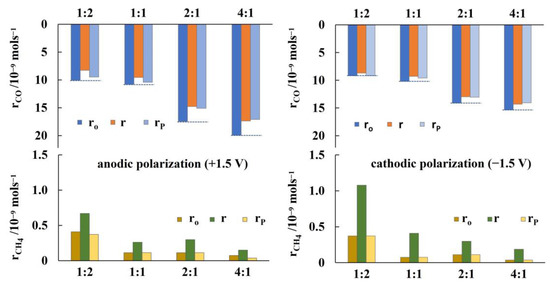 The non-reversible behavior of CO formation has been further investigated by repeated current and/or potential application, which have generally shown that upon current and/or potential interruption the rate of CO formation does not return to its initial open circuit value. Figure 6 summarizes the results for potentiostatic transient operation at different CO2 to H2 feed ratios. The bottom part of the figure shows that the increase in CH4 formation rate under anodic and cathodic polarization (+ and −1.5 V), which is more pronounced at high H2 to CO2 feeding ratios, is reversible. However, the CO formation rate, as shown in the top part of Figure 6, exhibits a “permanent”, non-reversible NEMCA behavior [60,61]. The guide (dotted) lines clearly show that this non-reversible effect of current and/or potential application is more pronounced at higher CO2 to H2 feed ratios.