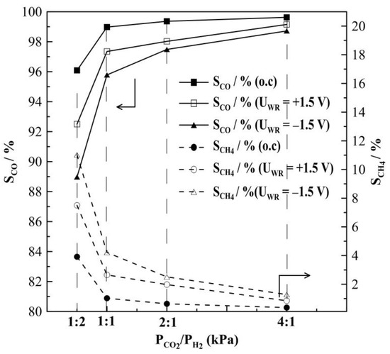 Steady-state effect of temperature on the selectivity to CO and CH4 formation under open circuit conditions and at different gas feeding ratios of CO2 to H2. FT = 50 cm3 min−1.