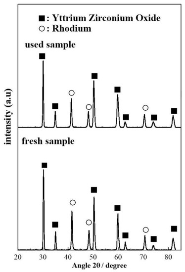 The diffractograms displayed in Figure 10 show no major differences in the phase distribution of the fresh and used sample. More specifically both diffractograms show clear reflections at 2θ = 30.3°, 35.0°, 50.4°, 59.9°, 62.9°, 74.1°, and 81.9°, which correspond to the (111), (200), (220), (311), (222), (400), (331) planes of YSZ [62,63,64,65,66,67]. In addition, both diffractograms show clear reflections at 41.5°, 48.4°, and 70.7° which correspond to the (111), (200), and (220) phases Rh particles in their metallic (Rh0) state [66]. No reflections corresponding to RhO2 or Rh2O3 were detected in the XRD measurements, suggesting that the chemical state of the Rh film is mostly metallic before and after use.