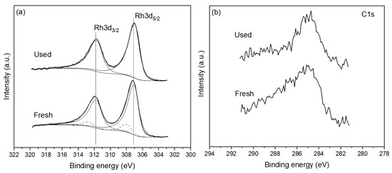 XPS measurements of the freshly reduced and post-reaction used catalyst sample. (a) Rh 3d and (b) C 1s regions.