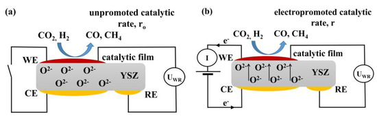 The electrochemical promotion of CO2 hydrogenation has been studied in recent years over different catalytic films including noble and non-noble metals (Ru [7,38,39,40,41,42,43] and Rh [44,45], and Ni, Co, Fe [46,47], respectively) supported on a variety of solid electrolytes including yttria-stabilized-zirconia (YSZ, an O2− conductor [7,38,44,45]), H+ conductors [40,43,46], and alkali ion conductors such as Na-β″-Al2O3 [40]. Under open circuit conditions, the non-promoted catalytic reaction takes place on the catalyst-working electrode. Application of a potential or current, between the catalyst film (working electrode) and a counter electrode, leads to changes of the conversion rate and product selectivity [7,38,48,49,50,51,52,53,54,55,56]. These non-Faradaic changes are evoked by the formation of an effective double layer due to the migration of promoting species (e.g., O2− in the case of YSZ) migrating from the solid electrolyte to the metal–gas interface [7,38,49,57,58,59].