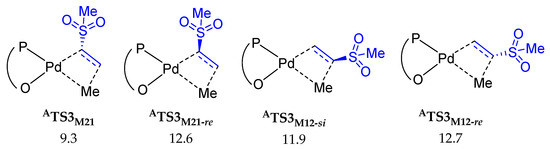 Four different enantioselective insertion transition states of MVS into the Pd–Me bond by complex A (in kcal/mol).