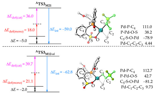 Distortion–interaction analyses (kcal/mol) and the geometrical structures (angles in degrees) of ATS3M21 and ATS3M12-si. All hydrogen atoms are hidden for clarity.