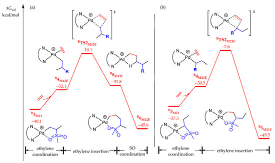 In sharp contrast to the phosphine–benzene sulfonate palladium, the typical α-diimine palladium catalyst B has been reported to be inactive for the copolymerization of ethylene with MVS [19]. In order to clarify the difference, the chain initiation (Figure 6) and chain propagation (Figure 7) processes in the copolymerization of ethylene with MVS medicated by model species B were also systematically calculated.