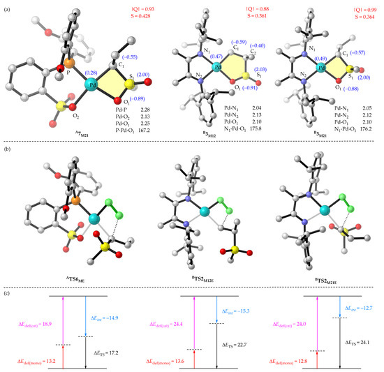 (a) Geometrical structures (distances (black numbers) in Å, angles (black numbers) in degrees, and NBO atomic charges (blue numbers in parentheses)) of A7M21, B3M12, and B3M21. (b) Geometrical structures of transition states ATS6ME, BTS2M12E, and BTS2M21E. (c) Distortion–interaction analysis for ATS6ME, BTS2M12E, and BTS2M21E (in kcal/mol). The S value denotes the average square error of charge (S = ∑ (|Qx| − |Q|)2/n, n = 5 or 4), where |Q| represents the unsigned average charge, and Qx denotes the charge on each atom included. All hydrogens atoms are hidden for clarity.