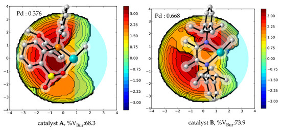 To further clarify the origin of insertion differences, distortion–interaction analyses [28,29,30,31] for TSs ATS6ME, BTS2M12E, and BTS2M21E were carried out (Figure 9c). The analysis scheme used was similar to that for ATS3M21 and ATS3M12-si (vide ante). It was found that the total deformation energies ΔEdef in ATS6ME, BTS2M12E, and BTS2M21E were 32.1 (18.9 + 13.2), 38.0 (24.4 + 13.6), and 36.8 (24.0 + 12.8) kcal/mol, respectively, whereas the interaction energies between these two fragments were computed to be −14.9, −15.3, and −12.7 kcal/mol for ATS6ME, BTS2M12E, and BTS2M21E, respectively. These results suggest that the larger geometrical deformations led to the higher energies (ΔETS = 22.7 and 24.1 kcal/mol), further destabilizing the BTS2M12E and BTS2M21E. To confirm these steric effects, a topographic steric map analysis of catalysts A and B was carried out (Figure 10). As expected, the percent of buried volume of the metal center in catalyst B (% VBur = 73.9) was significantly larger than that in A (% VBur = 68.3), which is in line with the results of the distortion–interaction analyses. The results obtained indicate that the catalytic performance was perhaps improved through modifying the catalyst with less sterically bulky ligands.