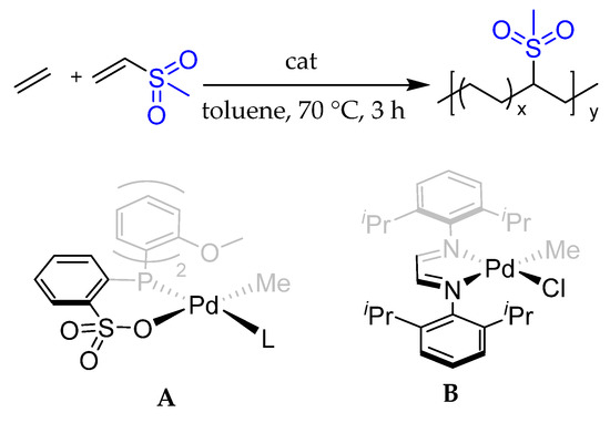 - Bouilhac, C.; Rünzi, T.; Mecking, S. Catalytic copolymerization of ethylene with vinyl sulfones. Macromolecules 2010, 43, 3589–3590. [Google Scholar] [CrossRef]