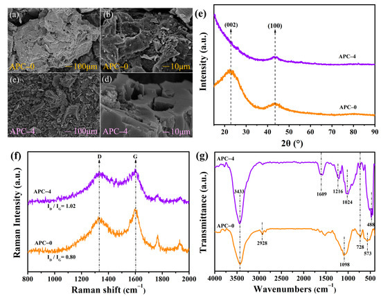 SEM images (a–d), XRD patterns (e), Raman spectra (f) and FTIR spectra (g) of APC–0 and APC–4.