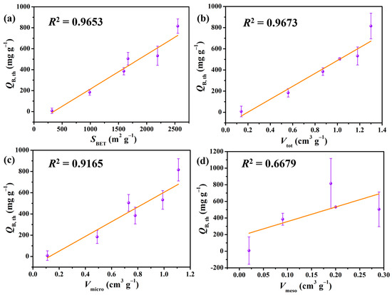 Relationship between QB,th and SBET (a), Vtot (b), Vmicro (c) and Vmeso (d) for APCs.
