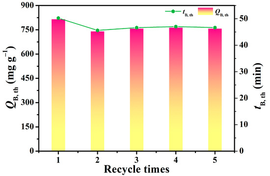 where q0 and a are the dose–response constants of the model, t is the adsorption time (min), and m is the mass of the adsorbent (g). By substituting the above parameters into the equation, the theoretical breakthrough time (tB,th) can be calculated at a Cout,t/Cin ≈ 5%, and by substituting the obtained tB,th into Equation (7), QB,th and Qm,th can be calculated.