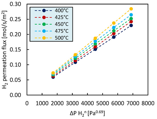 In Figure 4 the hydrogen flux through the membrane at different temperatures is represented as a function of the transmembrane pressure difference. The best fit for the hydrogen fluxes and hydrogen partial pressure difference across the membrane ( was found for a pressure exponent value of 0.69. In Pd-based membranes, the pressure exponent is 0.5 when the rate limiting step is diffusion through the bulk of palladium. A value of n deviating from 0.5 may indicate the presence of a contribution of the metallic support to the H2 transport mechanism, external mass transfer limitations, or limitations in the surface reactions [56,57].