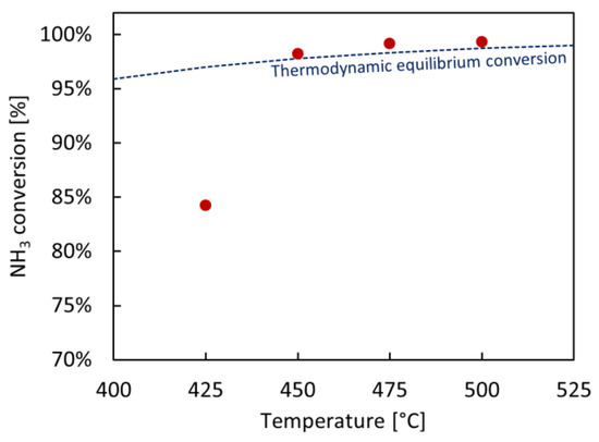 NH3 conversion achieved in the membrane reactor at 425–450–475–500 °C, 5 bara and under a feed flow rate of 0.5 LN/min of pure NH3 compared to the thermodynamic equilibrium conversion of the conventional system (without membrane).