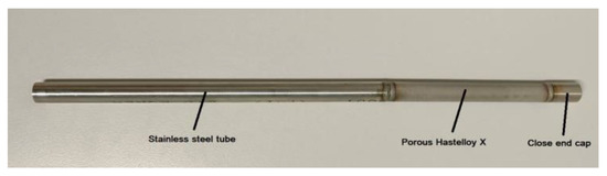 A commercial unrefined porous Hastelloy X filter with an outer diameter of 1.2 cm, average surface roughness (Ra) of 6.1 µm, and 0.5 µm nominal media grade (MG) was acquired from Hebei Golden Flame Wire Mesh Co, China. The filter was cut to 10 cm length and welded to dense stainless steel (AISI316L) tubes, to achieve a dead-end configuration (Figure 8).