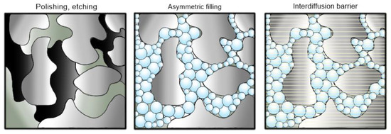 Illustration of support filter pre-treatments: the polishing-etching treatment promotes surface smoothening and gas permeation; the asymmetric filling reduces the superficial openings size; the mesoporous interdiffusion barrier deposition prevents Pd-support interaction while improving the support’s surface morphology.