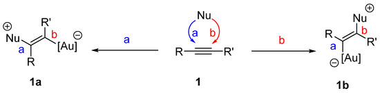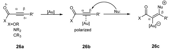 A major part of homogenous gold catalysis is related to activated alkynes, allenes and alkenes. Gold complexes with the carbon π-system (double or triple C–C bond) are exposed to the attack of nucleophilic moieties according to Scheme 1.