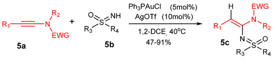 The reaction of ynamides 5a with sulfoximines 5b catalyzed by Ph3PAuCl/AgOTf to afford the sulfoximinated products 5c (Wang and Chen 2016) [42].