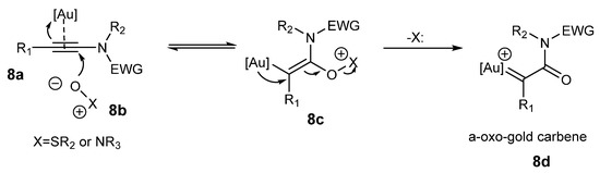 Formation of α-oxo gold carbenes 8d from ynamide substrates 8a and X+-O− nucleophiles [4].
