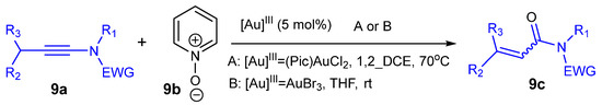 Scheme 9 shows the synthesis of α,β-unsaturated carbonyl derivatives 9c from the reaction of pyridine N-oxide 9b and ynamides 9a catalyzed by different forms of Au(III).