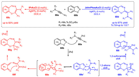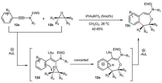 In the synthesis of dihydrobenzoxepines 12c by the formal [4+3] cycloaddition between ynamides 12a and epoxides 12b catalyzed by IPrAuNTf2, retention of stereochemistry was observed (Scheme 12) [48]. Moreover, the reaction proceeded under a wide variety of substituents not only on ynamide 12a but also on epoxide 12b. The proposed mechanism of the reaction is that an initial nucleophilic attack of the epoxide 12b onto the activated ynamide leads to oxonium intermediate 12d. Possibly, the orientation of the attack is very strict due to the conformation constraint that the aryl group induces the oxiranyl ring orientation. In addition, a synchronous breaking of the bond C–O in the oxirane 12d and the formation of the bond C–C between the aryl group and oxirane can contribute to the conservation of the stereochemical conformation [48].
