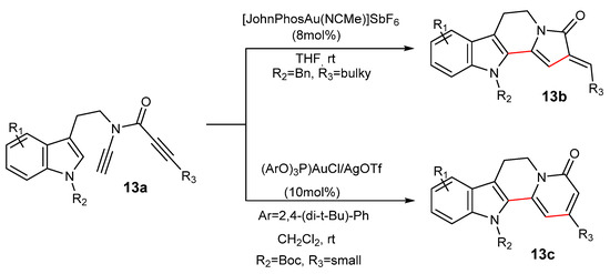 An example of gold(I)-catalyzed cycloisomerization is the reaction of the ynamide in Scheme 13. Using either (ArO)3P)AuCl/AgOTf or [(JohnPhos)Au(NCMe)]SbF6 as a gold(I) catalyst, the activated ynamide 13a is attacked at the α-carbon by the nucleophilic C2 indole carbon forming a six-member ring condensed with indole regioselectively. At the second step, a 5-exo-dig or 6-endo-dig cyclization leads to the formation of the two types of fused indole N-heterocycles 13b or 13c. The role of the R3 alkyl group is critical. A sizeable R3 group favors a 5-exo-dig attack while a small one urges the 6-endo-dig path [49].