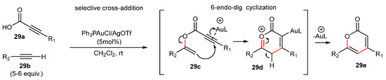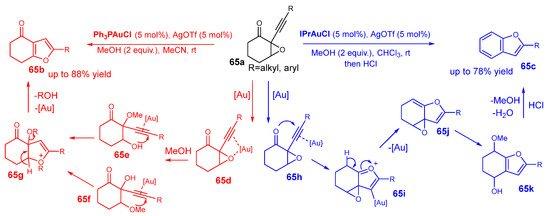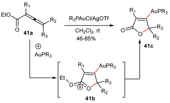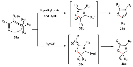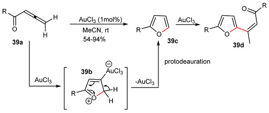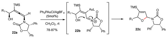 Thus, in the first case (Scheme 22), a nucleophilic attack of the hydroxyl group to the α-carbon of the activated allene with Ph3PAuCl/AgBF4 catalyst can form intermediate 22b. After protodeauration, the dihydrofuran 22c was formed in good yields and within a short reaction time (e.g., 5 min).