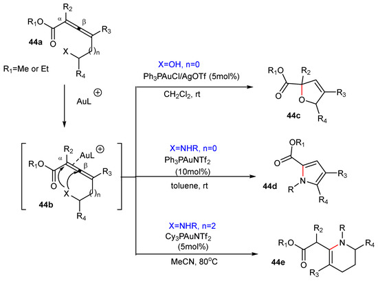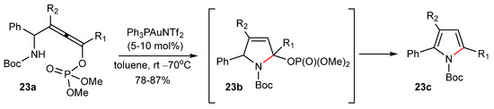 The most common Au(I)-catalyzed functionalizations with O- and N-nucleophiles are the intramolecular ones, e.g., the formation of the dihydrofuran 22c or pyrrole 23c starting from allenes 22a [58] or 23a [59] with a vicinal hydroxyl or amino group, respectively. The first steps of both reactions are probably similar.
