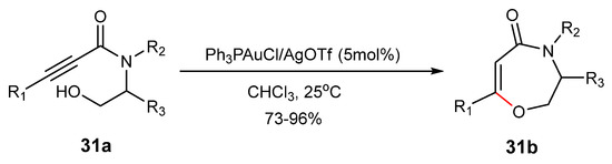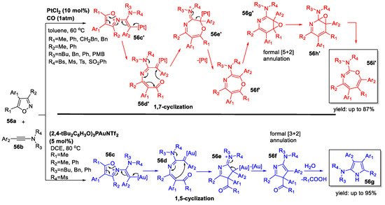 - Shen, W.-B.; Xiao, X.-Y.; Sun, Q.; Zhou, B.; Zhu, X.-Q.; Yan, J.-Z.; Lu, X.; Ye, L.-W. Highly Site Selective Formal [5+2] and [4+2] Annulations of Isoxazoles with Heterosubstituted Alkynes by Platinum Catalysis: Rapid Access to Functionalized 1,3-Oxazepines and 2,5-Dihydropyridines. Angew. Chem. Int. Ed. 2017, 56, 605–609. [Google Scholar] [CrossRef]