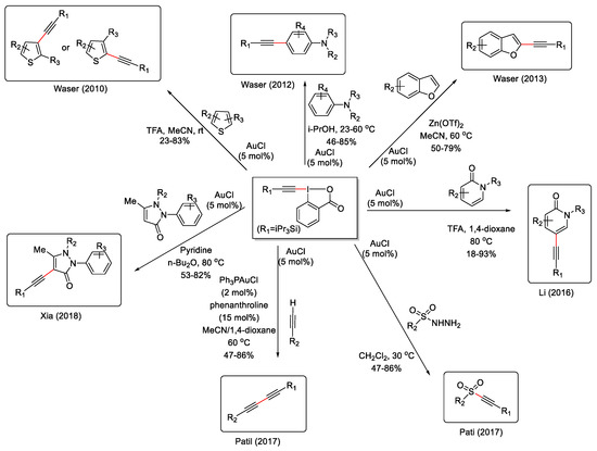 - Banerjee, S.; Patil, N.T. Exploiting the Dual Role of Ethynylbenziodoxolones in Gold-Catalyzed C(Sp)-C(Sp) Cross-Coupling Reactions. Chem. Commun. 2017, 53, 7937–7940. [Google Scholar] [CrossRef]