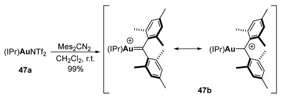 - Echavarren, A. Carbene or Cation? Nat. Chem. 2009, 1, 431–433. [Google Scholar] [CrossRef]