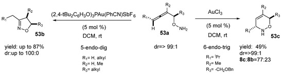 - Winter, C.; Krause, N. Structural Diversity through Gold Catalysis: Stereoselective Synthesis of N-Hydroxypyrrolines, Dihydroisoxazoles, and Dihydro-1,2-Oxazines. Angew. Chem. Int. Ed. 2009, 48, 6339–6342. [Google Scholar] [CrossRef]