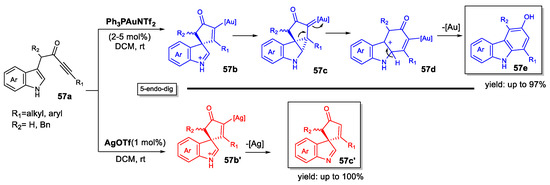 - Álvarez, E.; Miguel, D.; García-García, P.; Fernández-Rodríguez, M.A.; Rodríguez, F.; Sanz, R. Solvent and Ligand Induced Switch of Selectivity in Gold(I)-Catalyzed Tandem Reactions of 3-Propargylindoles. Beilstein J. Org. Chem. 2011, 7, 786–793. [Google Scholar] [CrossRef] [PubMed]
