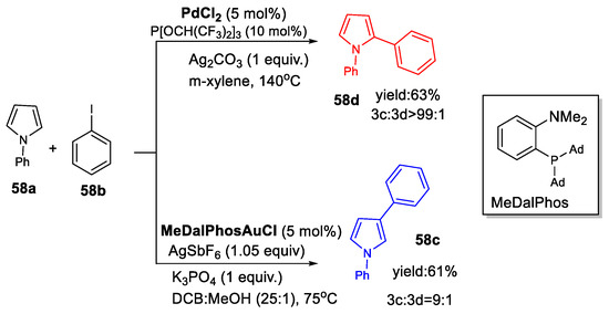 - Rodriguez, J.; Zeineddine, A.; Sosa Carrizo, E.D.; Miqueu, K.; Saffon-Merceron, N.; Amgoune, A.; Bourissou, D. Catalytic Au(I)/Au(III) Arylation with the Hemilabile MeDalphos Ligand: Unusual Selectivity for Electron-Rich Iodoarenes and Efficient Application to Indoles. Chem. Sci. 2019, 10, 7183–7192. [Google Scholar] [CrossRef] [PubMed]