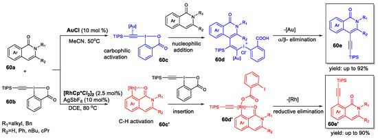- Shaikh, A.C.; Shinde, D.R.; Patil, N.T. Gold vs Rhodium Catalysis: Tuning Reactivity through Catalyst Control in the C-H Alkynylation of Isoquinolones. Org. Lett. 2016, 18, 1056–1059. [Google Scholar] [CrossRef]
