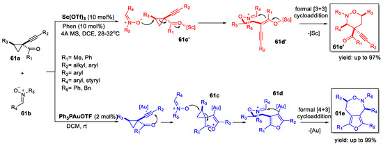 - Zhang, Y.; Zhang, J. Kinetic Resolution of 1-(1-Alkynyl)Cyclopropyl Ketones by Gold(I)-Catalyzed Asymmetric [4+3]Cycloaddition with Nitrones: Scope, Mechanism and Applications. Chem. Commun. 2012, 48, 4710–4712. [Google Scholar] [CrossRef]