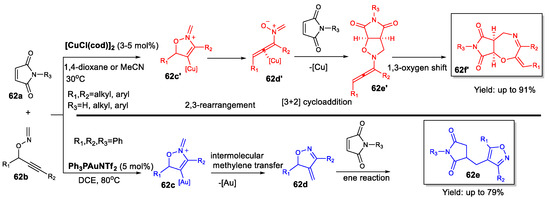 - Nakamura, I.; Gima, S.; Kudo, Y.; Terada, M. Skeletal Rearrangement of O-Propargylic Formaldoximes by a Gold-Catalyzed Cyclization/Intermolecular Methylene Transfer Sequence. Angew. Chem. Int. Ed. 2015, 54, 7154–7157. [Google Scholar] [CrossRef] [PubMed]